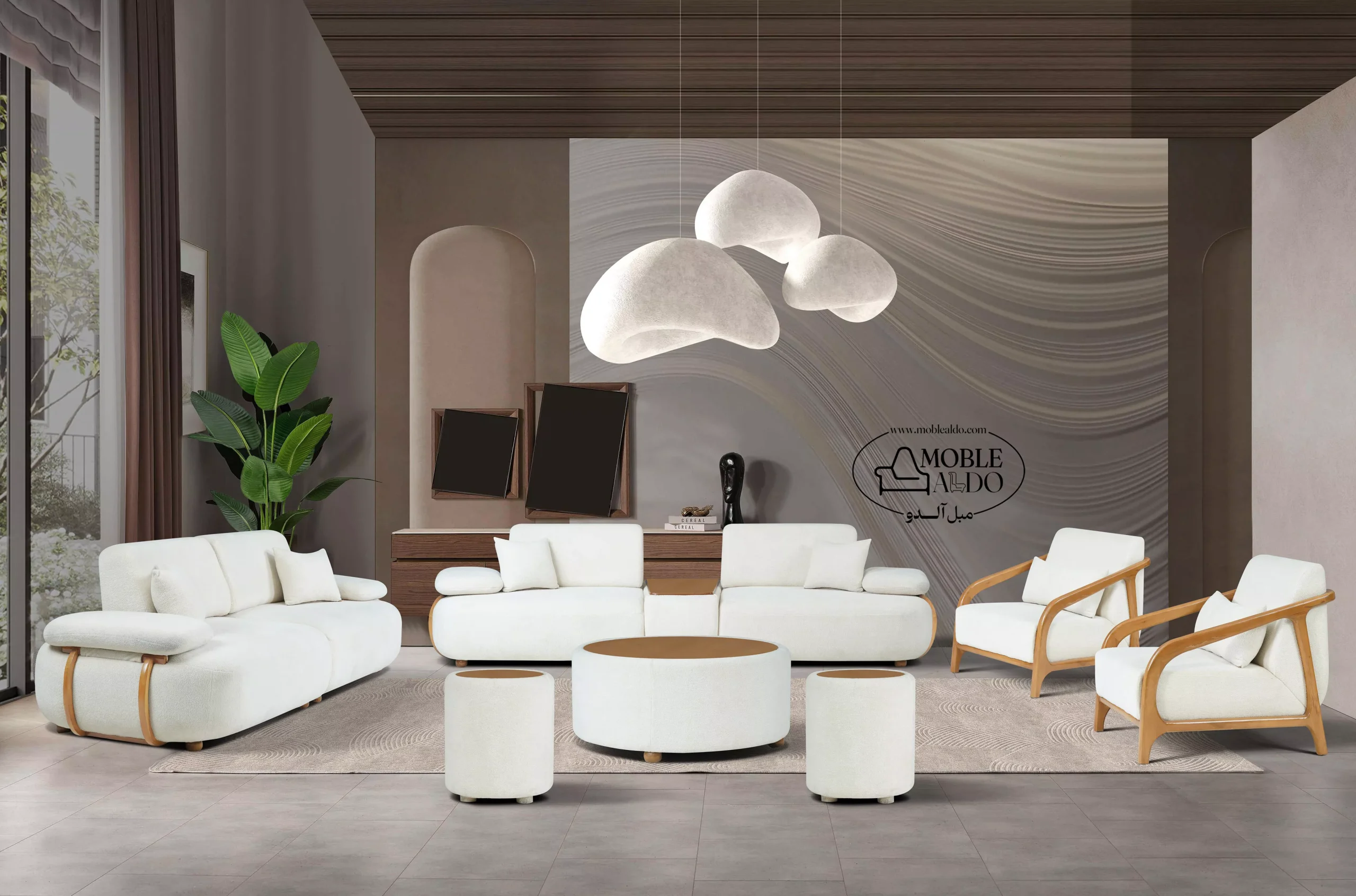 تعداد نشیمن: 8 نفره شامل 1+1+3+3 همراه با جلومبلی و دو عدد عسلی و کنسول وسط سه نفره