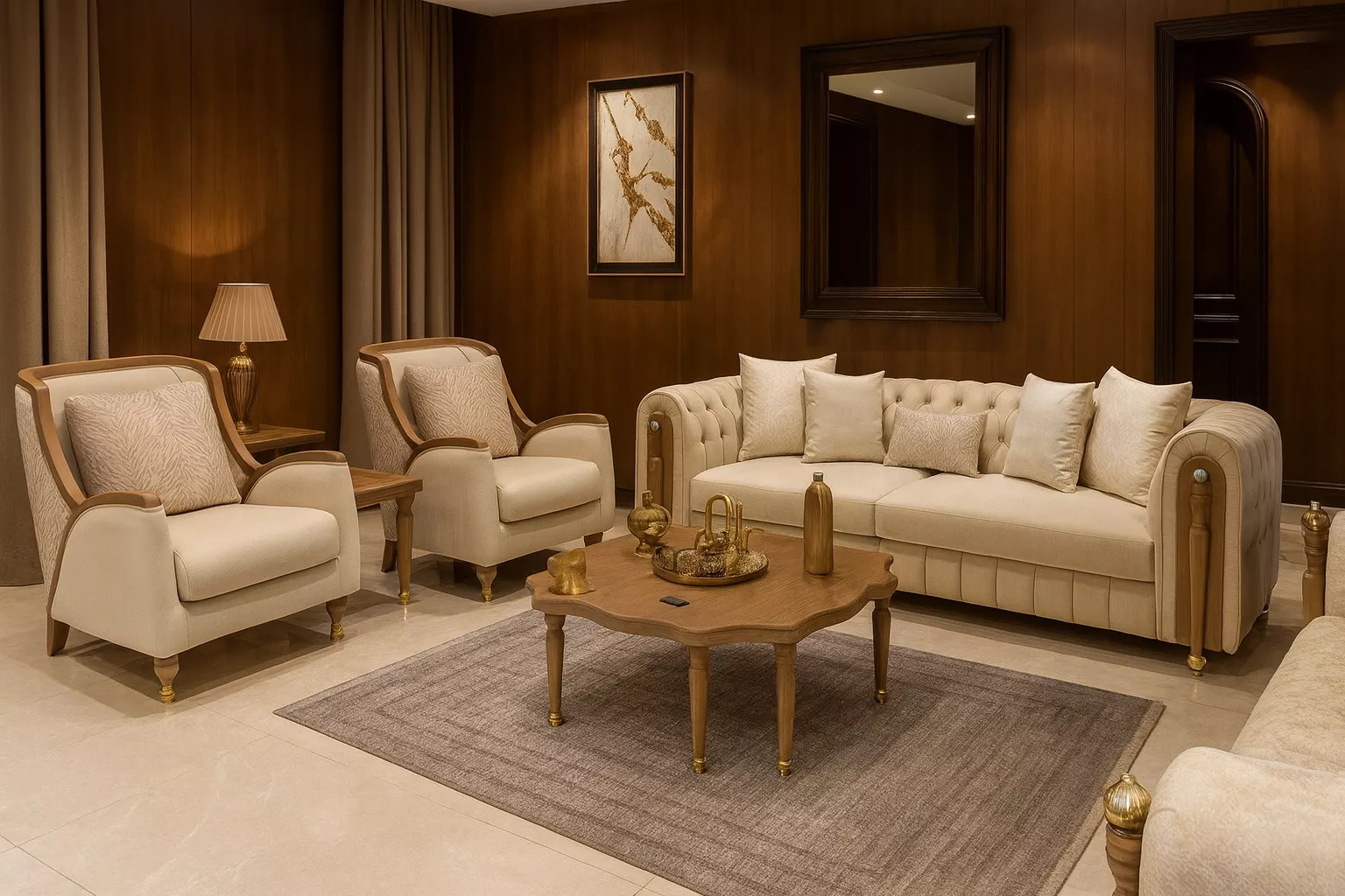 تعداد نشیمن: 8 نفره شامل 1+1+3+3 همراه با جلومبلی و دو عدد عسلی